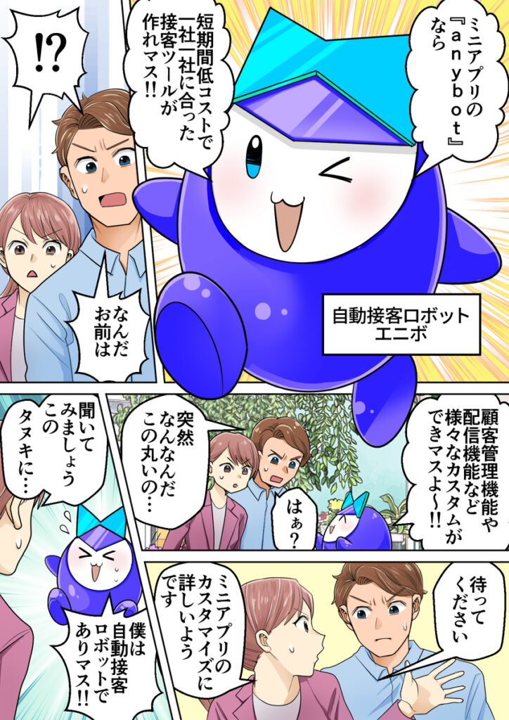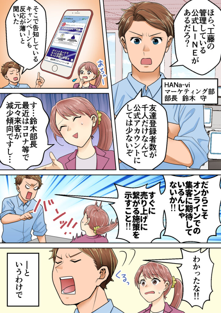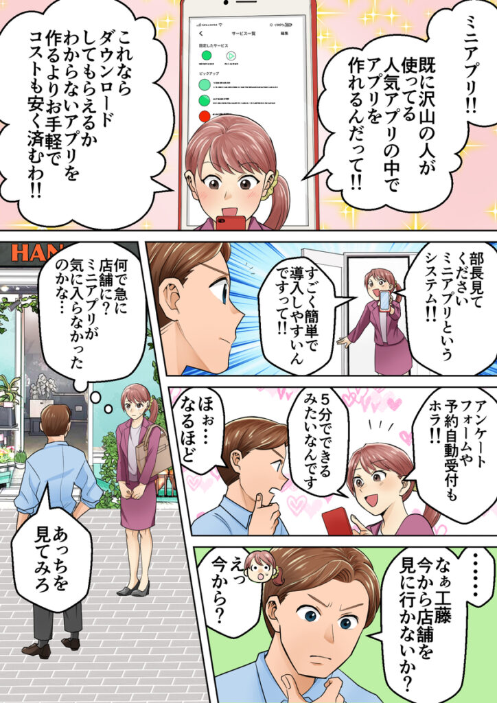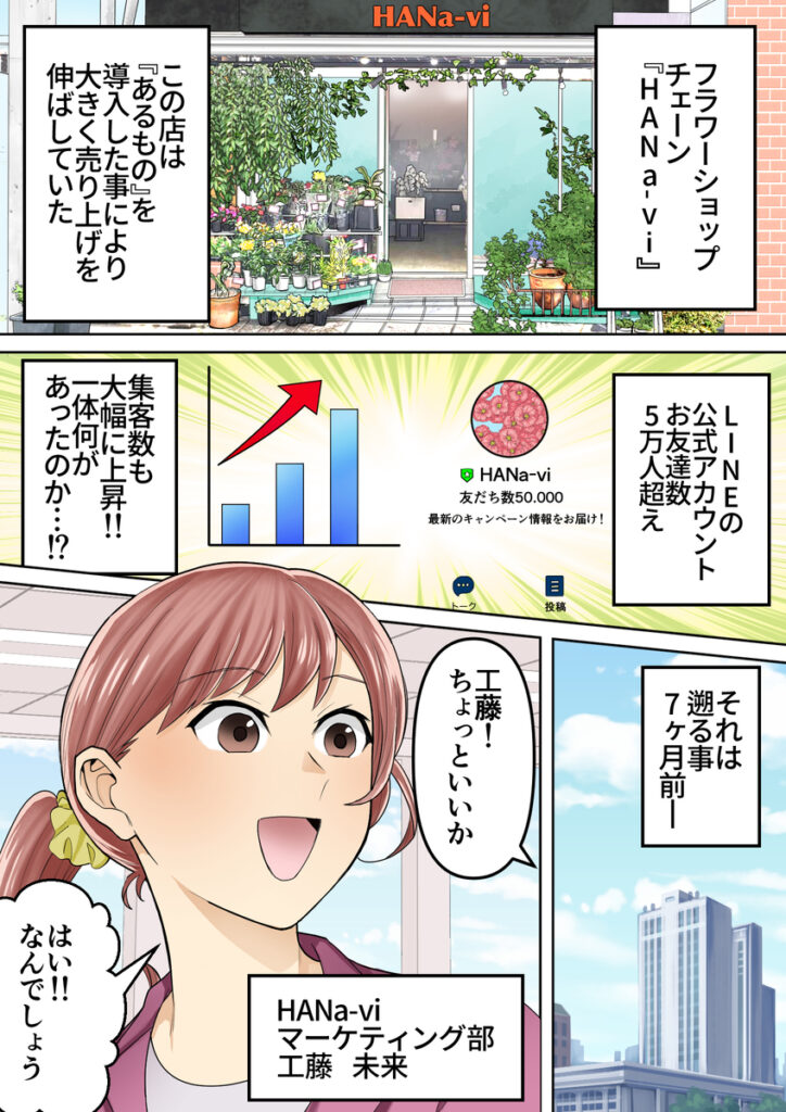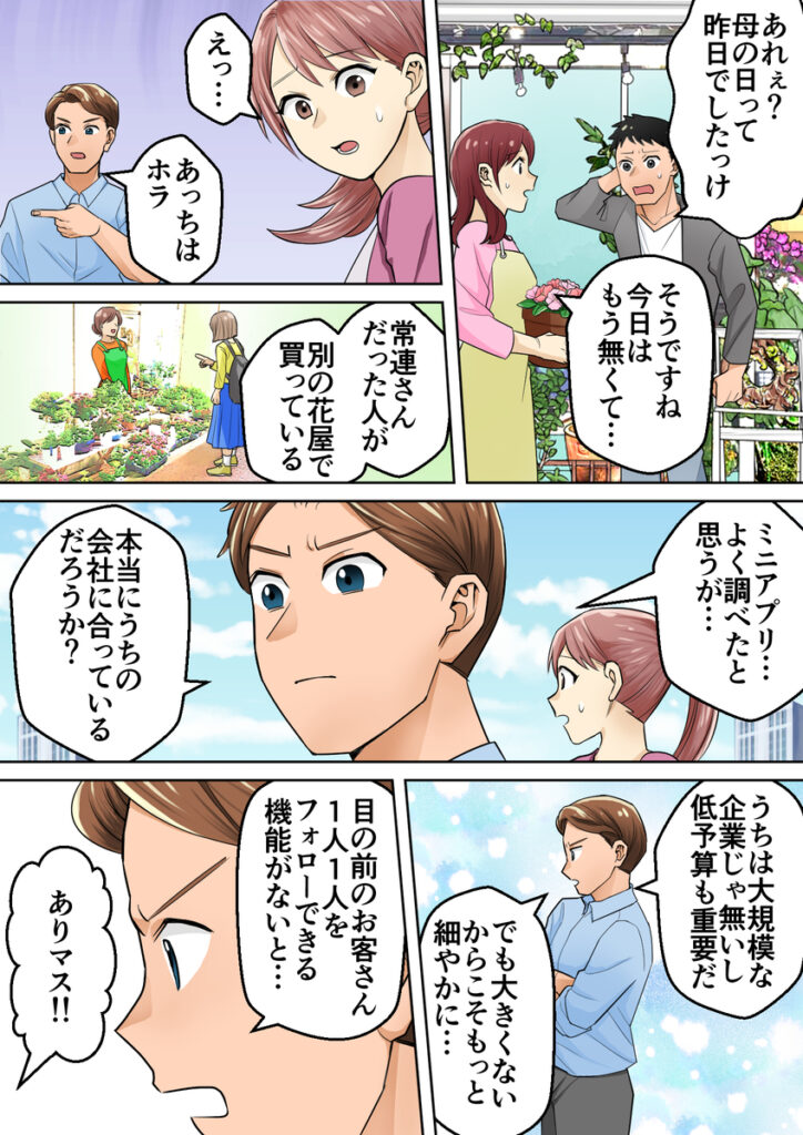 【漫画】フラワーショップ ミニアプリ導入事例-前編 2021 9/07 2021年9月7日2026年3月13日 無料相談をする 資料ダウンロード URLをコピーする URLをコピーしました! 【漫画】フラワーショップ ミニアプリ導入事例-後編 【LINE友だち1年で10万人!】注目のフェムテック企業「mederi(メデリ)」のデジタル戦略とは? 関連記事 【友だち登録者50万人突破】オンライン診療サービスmederiに学ぶ、anybotを活用した「成長を続ける」LINE活用とは? 2026年2月25日 【anybot for ChatGPT 導入事例】コールセンターしか対応できなかった質問もAIが24時間対応 9割のお客様が「満足」と回答 2024年5月23日 【問い合わせ対応の負担軽減】お客様対応からダイエット相談まで!サニーヘルスが導入したAIチャットボットとは 2024年5月22日 【応用の利きやすさが鍵】パートナーのHRDXが考えるanybotとは? 2023年8月15日 【クーポン利用率が2.4倍に】GIBのコインランドリー『ブルースカイランドリー』がLINEへの一元化で起こしたCX変革とは? 2023年7月26日 【LINE経由の売上40%UP】ナチュラルデイリーケアブランドecostoreが活用する「伴走プラン」とは? 2023年7月5日 【LINEを活用して相続を身近に】インフロントの相続案内サービス「ココカラ相続」とは 2023年6月26日 【病気の種から解決を】Kids Publicが行うオンライン相談サービスとは 2023年6月14日