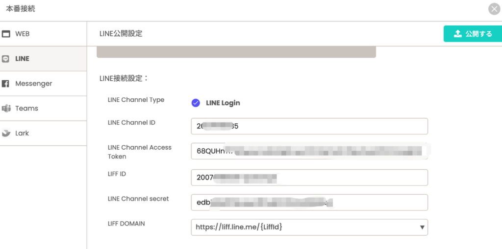 3.anybotの管理画面にて、LINE接続を行う。