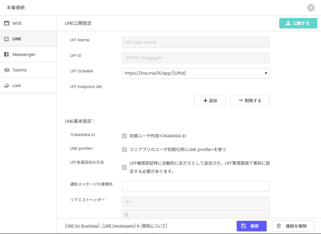 「+追加」ボタンより、他のミニアプリ接続情報を入力