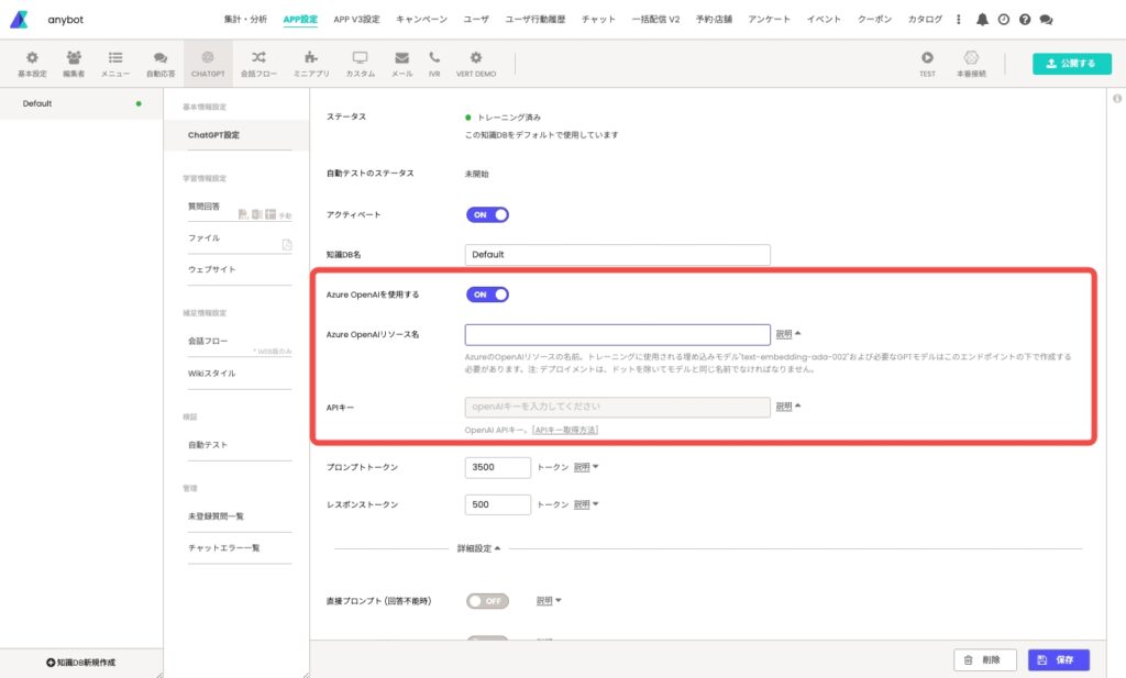 AzureOpenAI の API Key と プロジェクト名をanybotの管理画面に埋めていただき、トレーニングを行う。