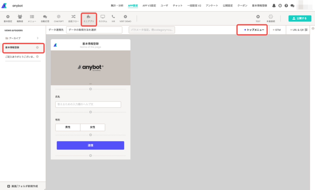 1.2 編集を行いたいミニアプリを「トップメニュー」に固定