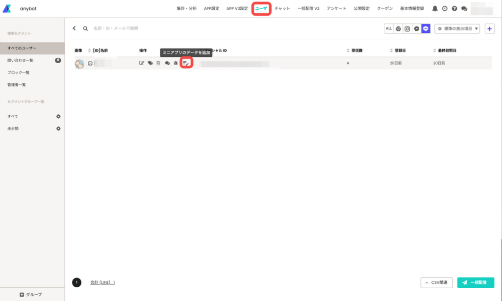 1.4「ユーザ」一覧画面にて、[ミニアプリのデータを編集]のボタンをクリックして、