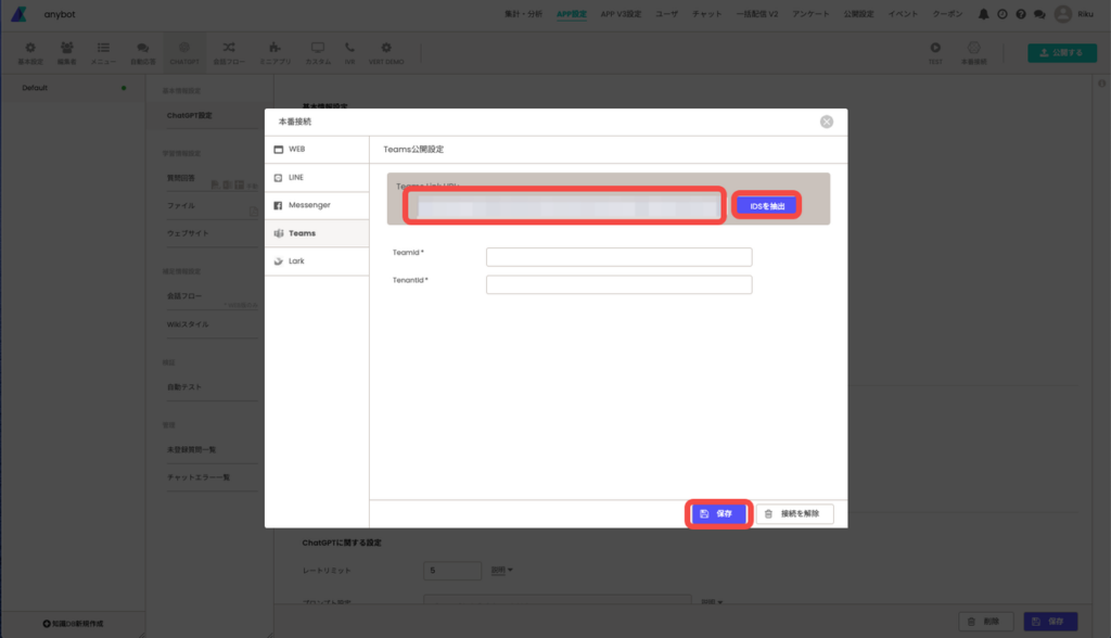 1.6anybotの管理画面にログインして、本番設定>「teams」の画面を開いて、