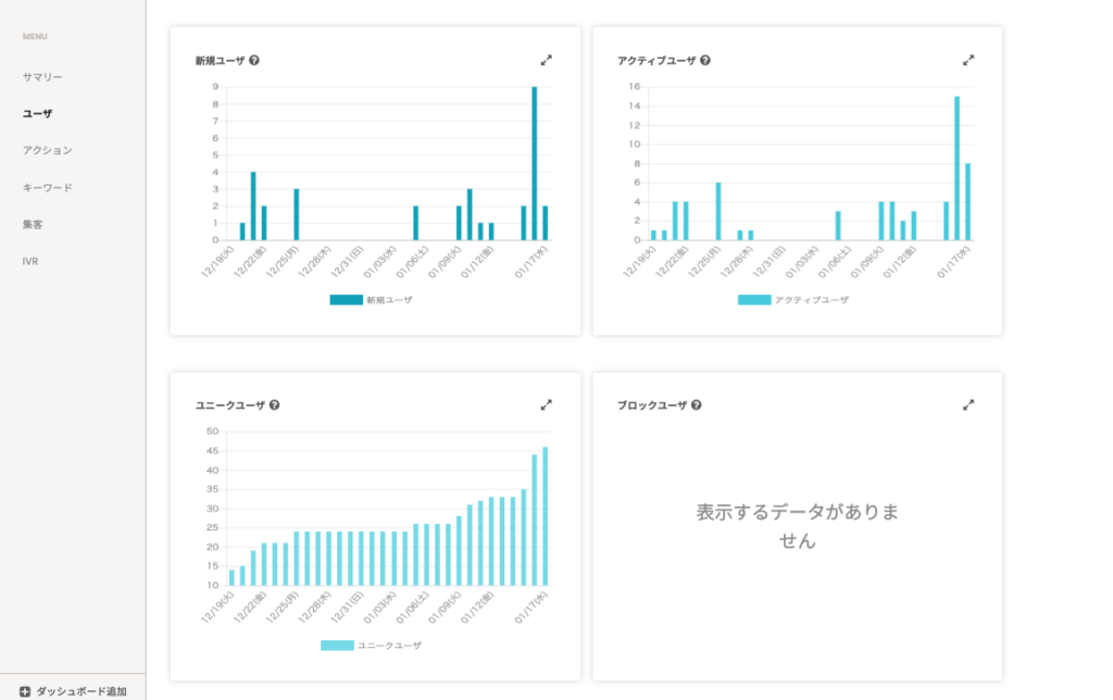 新規ユーザ、アクティブユーザ、ユニークユーザ、ブロックユーザのブロックより表示されます。