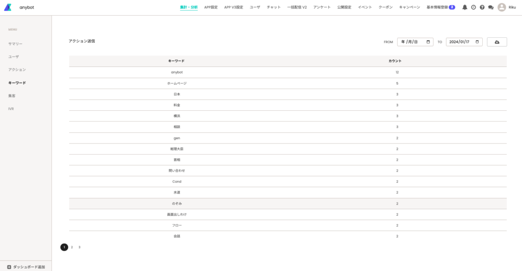 2.Teamsを利用したユーザーの送信したキーワードの項目と送信回数の確認方法 anybotの管理画面>集計分析>キーワードをクリック